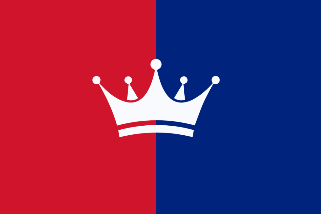 Two equal vertical bands stretch across the flag: crimson red on one side, royal blue on the other. At the very center shines a bold white crown, standing as a mark of indigenous leadership, dignity, and the authority of the people.